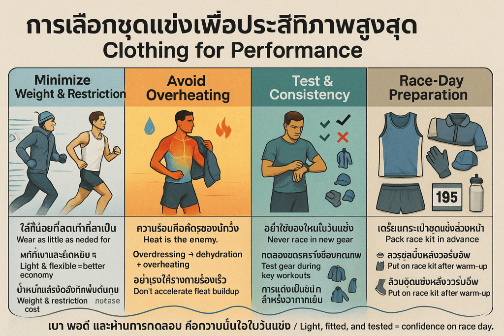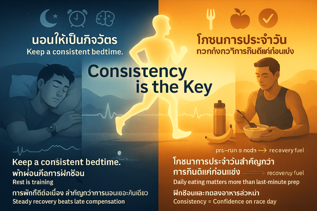 - ความเหมาะสม: การพยายามวิ่งแบบ Negative Splits (วิ่งเร็วขึ้นเรื่อย ๆ ตลอดการแข่งขัน) เป็นหนึ่งในเป้าหมายเชิงกระบวนการที่ถูกต้อง งานวิจัยสนับสนุนกลยุทธ์การวิ่งด้วย จังหวะที่สม่ำเสมอหรือ Negative Split เล็กน้อย ซึ่งให้ผลลัพธ์เวลาที่เร็วที่สุดสำหรับการแข่งขันระยะยาว