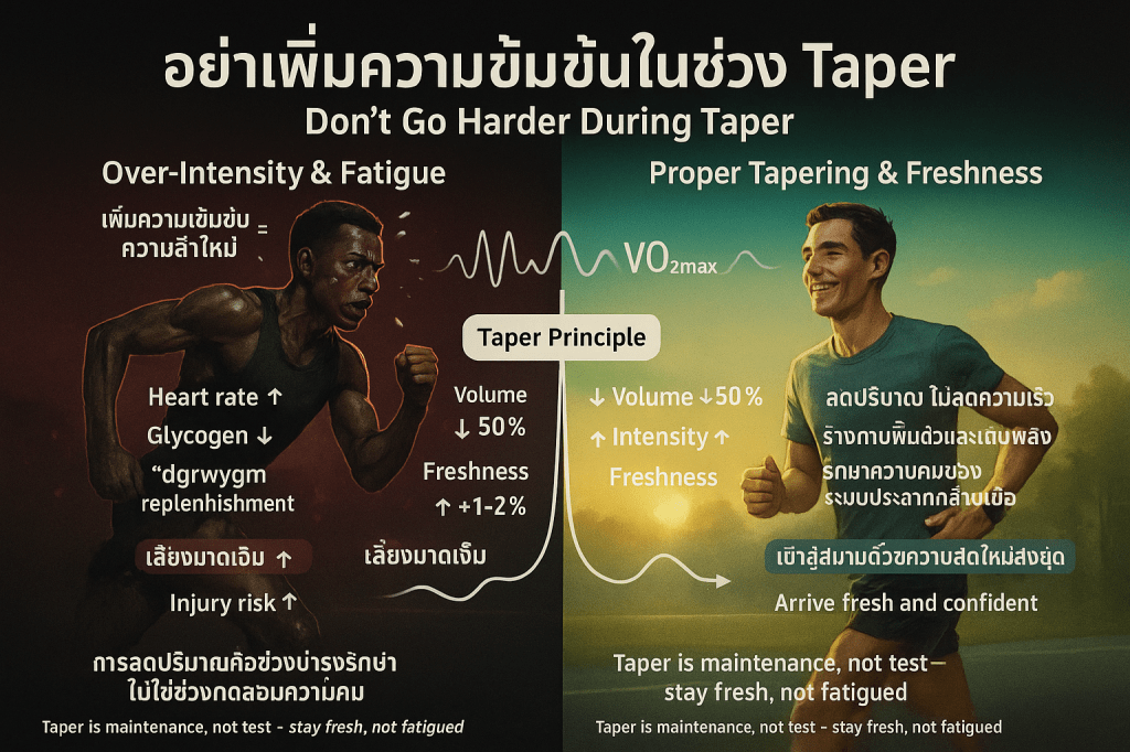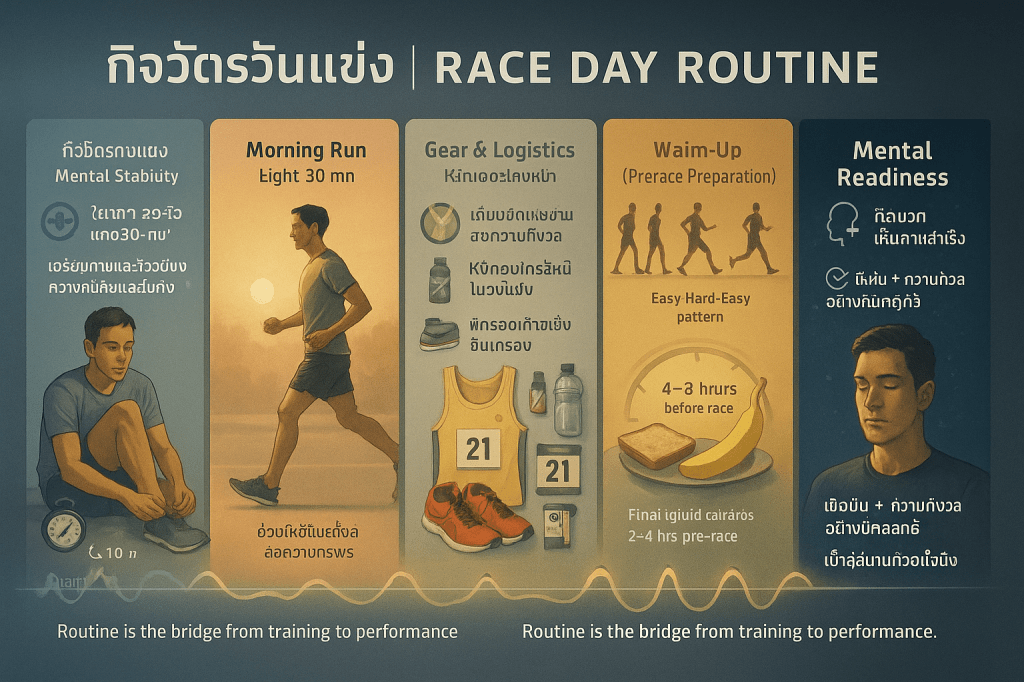 - Race-Pace Running: การวิ่ง 2 x 400 เมตร หรือ 2-3 x 200 เมตร ด้วย จังหวะที่ตั้งใจจะใช้ในช่วงเปิดตัวการแข่งขัน ช่วยให้นักวิ่งได้รับความรู้สึกของจังหวะ