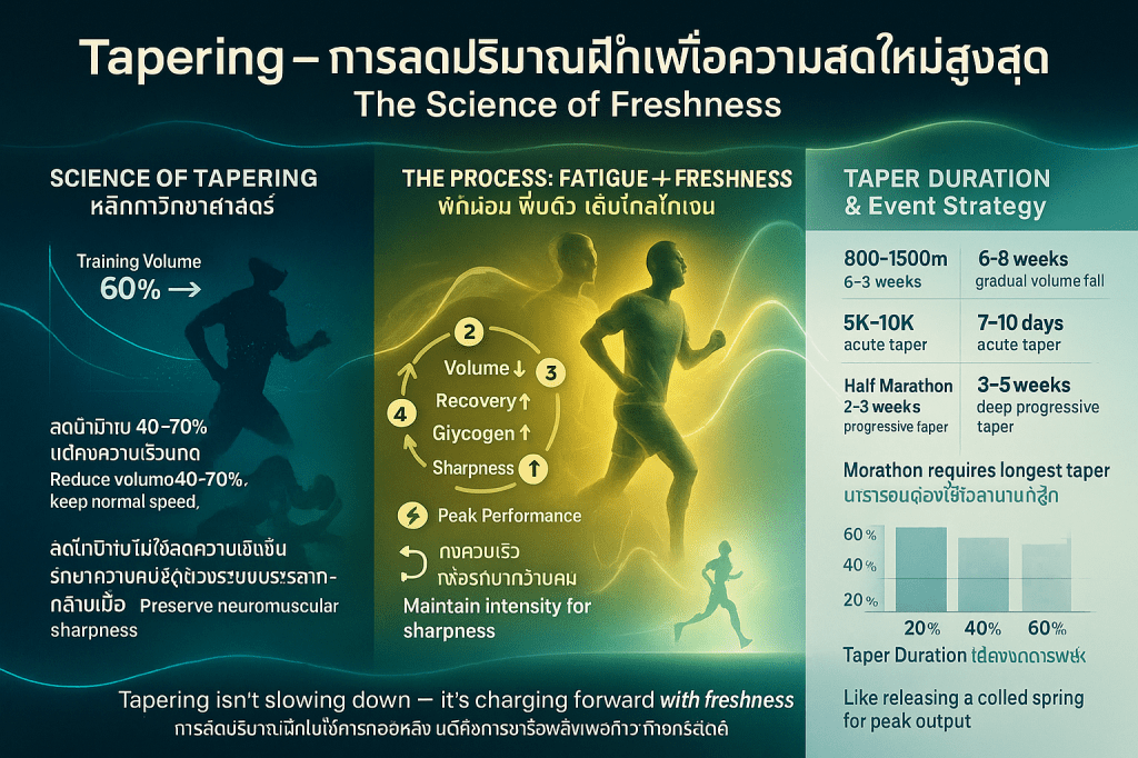 - ช่วงกลางฤดูกาล (Bulk of the Season): เมื่อผ่านเข้ารอบแล้ว ควรใช้เวลาในช่วงกลางฤดูกาลไปกับการฝึกซ้อมและการแข่งขันใน ระยะที่สั้นกว่า (Underdistance) และ ระยะที่ยาวกว่า (Overdistance) ระยะเป้าหมายหลัก