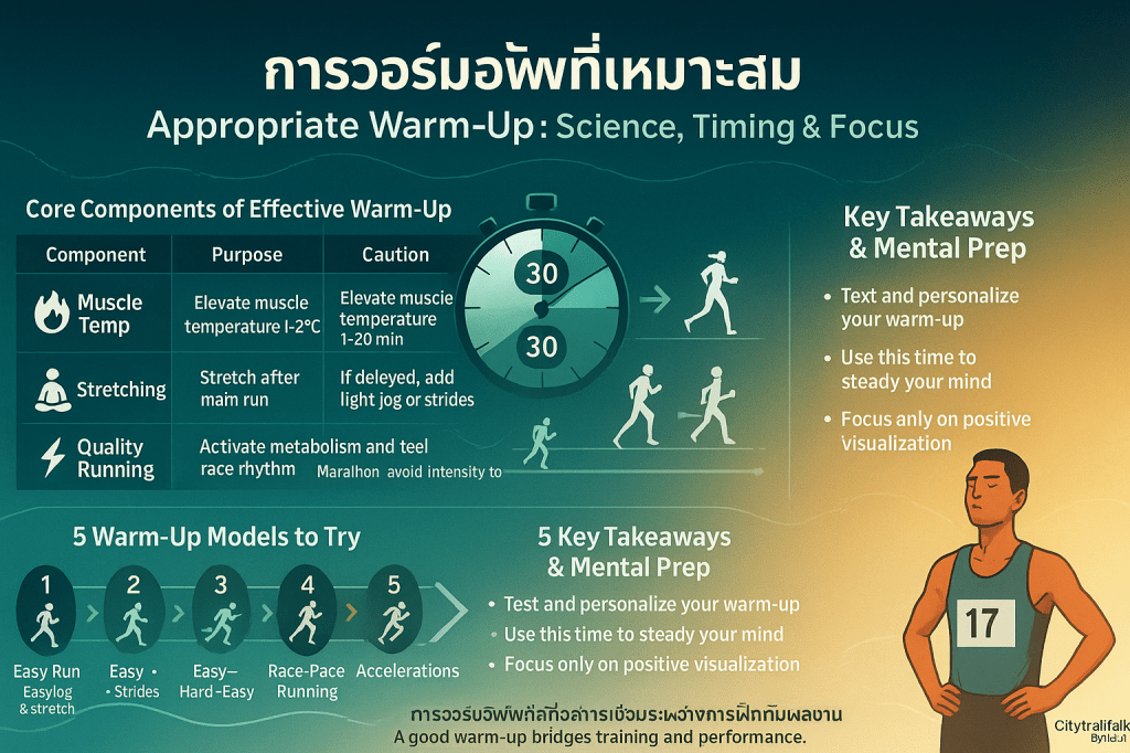 - คำเตือน: การ Warm-Up ที่เน้นการวิ่งเร็วช่วงสั้น ๆ มากเกินไป อาจนำไปสู่การออกตัวที่เร็วเกินความต้องการในวันแข่งขันได้ หากจังหวะแข่งไม่สอดคล้องกับจังหวะสุดท้ายที่ใช้ในการวอร์มอัพ