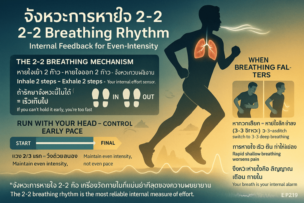 - การต่อสู้กับอาการจุก (Side Stitch): หากเกิดอาการจุก (stabbing pain in the abdomen) ให้พยายาม หายใจช้าลงและลึกขึ้น (โดยเฉพาะการใช้รูปแบบ 3-3) การหายใจตื้นและเร็วจะทำให้อาการแย่ลง