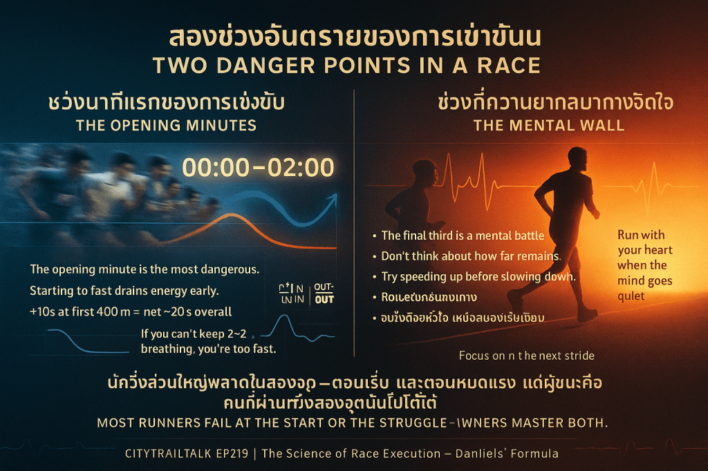 - การหลีกเลี่ยงข้อผิดพลาด: การใช้ “หัว” ควบคุมความเร็วในช่วงต้นช่วยให้มั่นใจได้ว่านักวิ่งจะไม่ตกอยู่ในสถานการณ์ที่ต้องสูญเสียพลังงานและจิตใจจากการออกตัวที่เร็วเกินไป ซึ่งเป็นความผิดพลาดที่เกิดขึ้นบ่อยที่สุดในการแข่งขันระยะไกล