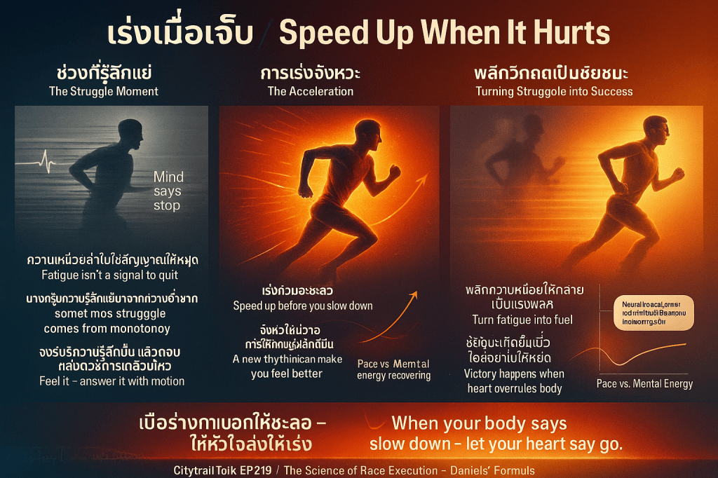- เหตุผล: บางครั้งความรู้สึกเหนื่อยล้าเกิดจาก ความซ้ำซากจำเจของจังหวะวิ่งคงที่ (unvarying pace) และการเร่งจังหวะเล็กน้อยอาจทำให้เกิดการเปลี่ยนแปลงทางจิตวิทยาและทำให้รู้สึกดีขึ้น