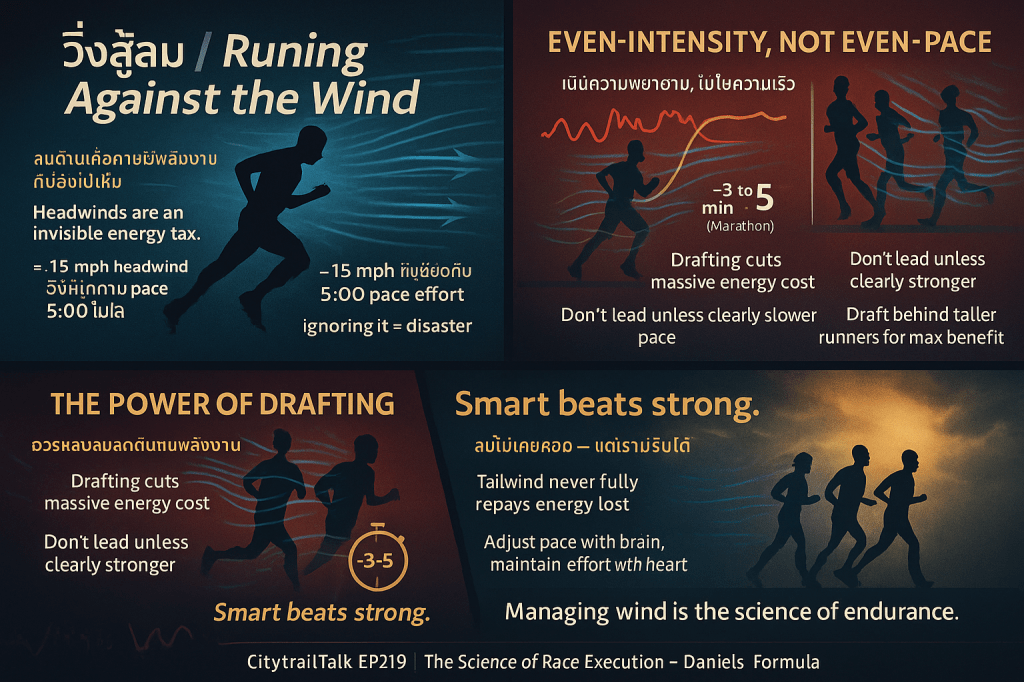 - การต่อสู้กับลม (Headwinds) และการหลบลม (Drafting):
