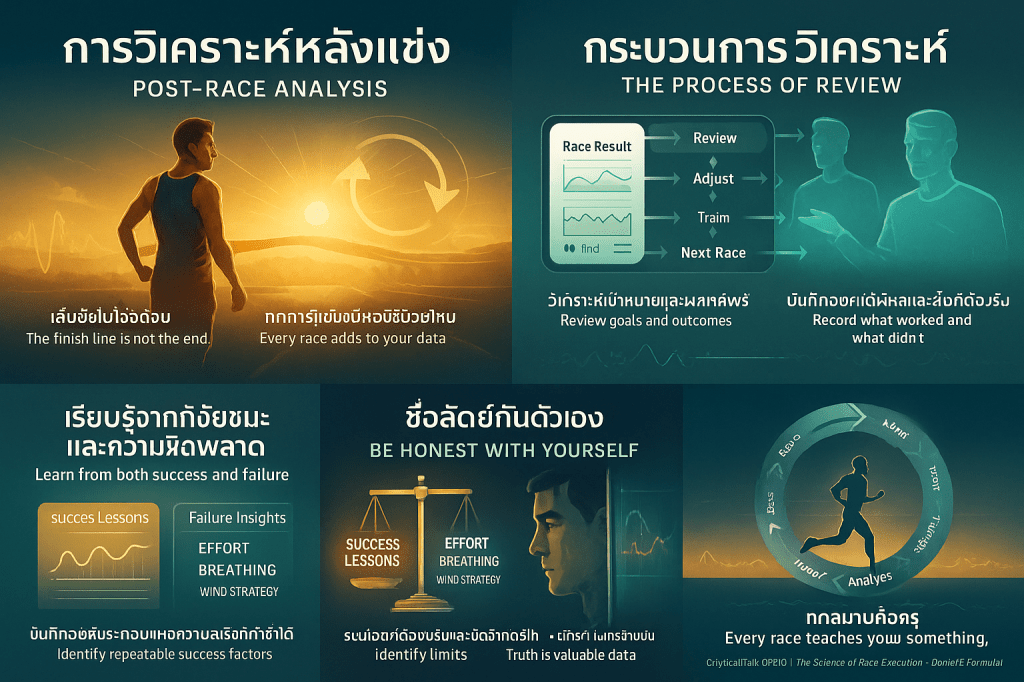 โดยสรุปแล้ว การวิเคราะห์หลังแข่งคือการเปลี่ยนความเหนื่อยล้าทางร่างกายให้เป็น ความได้เปรียบทางกลยุทธ์ นักวิ่งที่เก่งที่สุดจะมองทุกการแข่งขัน แม้แต่การแข่งขันที่แย่ที่สุด ว่าเป็นข้อมูลที่มีค่าที่ต้องนำมาใช้เพื่อปรับแผนการฝึกซ้อมและกลยุทธ์การก้าวเท้าสำหรับการแข่งขันครั้งถัดไป