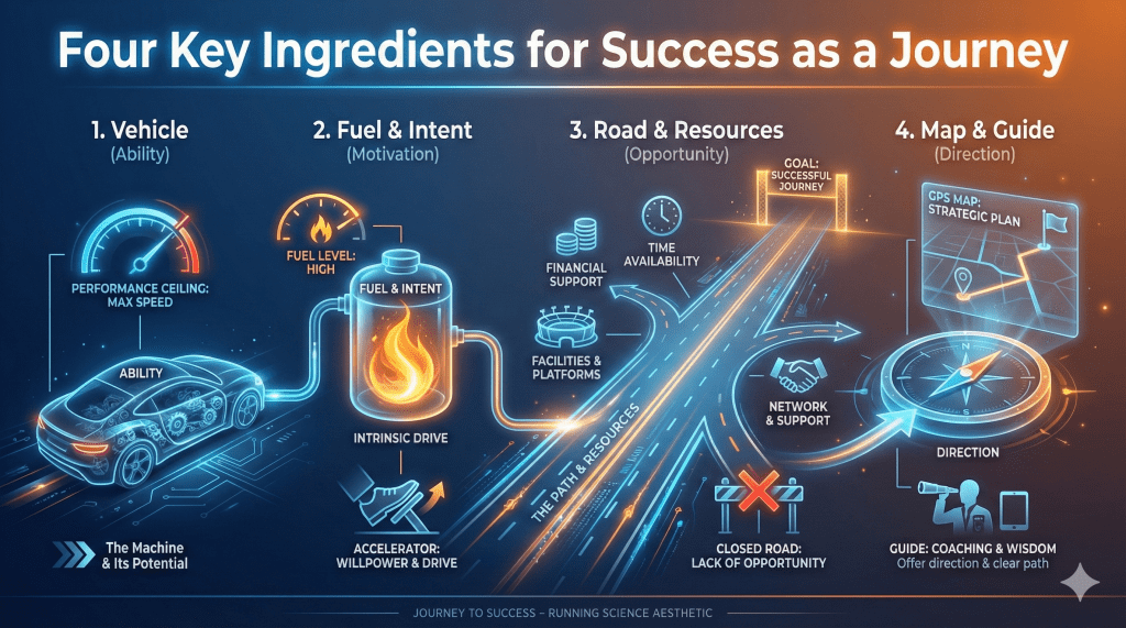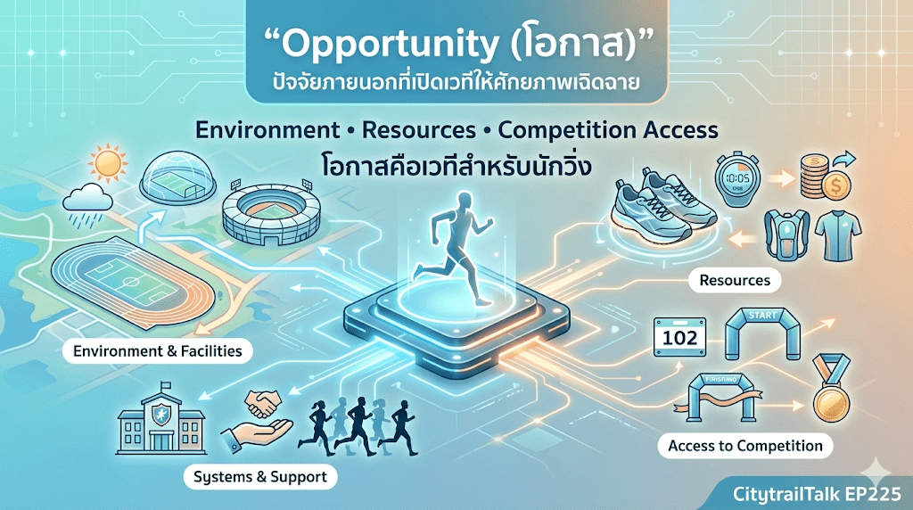 โอกาสจึงเป็นเสมือน เวที ที่จัดเตรียมไว้ให้ หากนักแสดง (นักวิ่ง) มีพรสวรรค์ (ความสามารถโดยกำเนิด) และความมุ่งมั่น (แรงจูงใจ) แต่ไม่มีเวทีที่เหมาะสม (โอกาส) เช่น ไม่มีโรงละคร หรือไม่มีผู้สนับสนุน พวกเขาก็ไม่สามารถแสดงความสามารถและบรรลุความสำเร็จสูงสุดได้