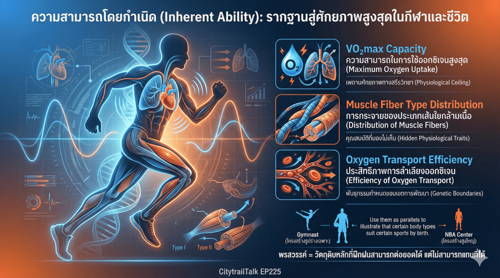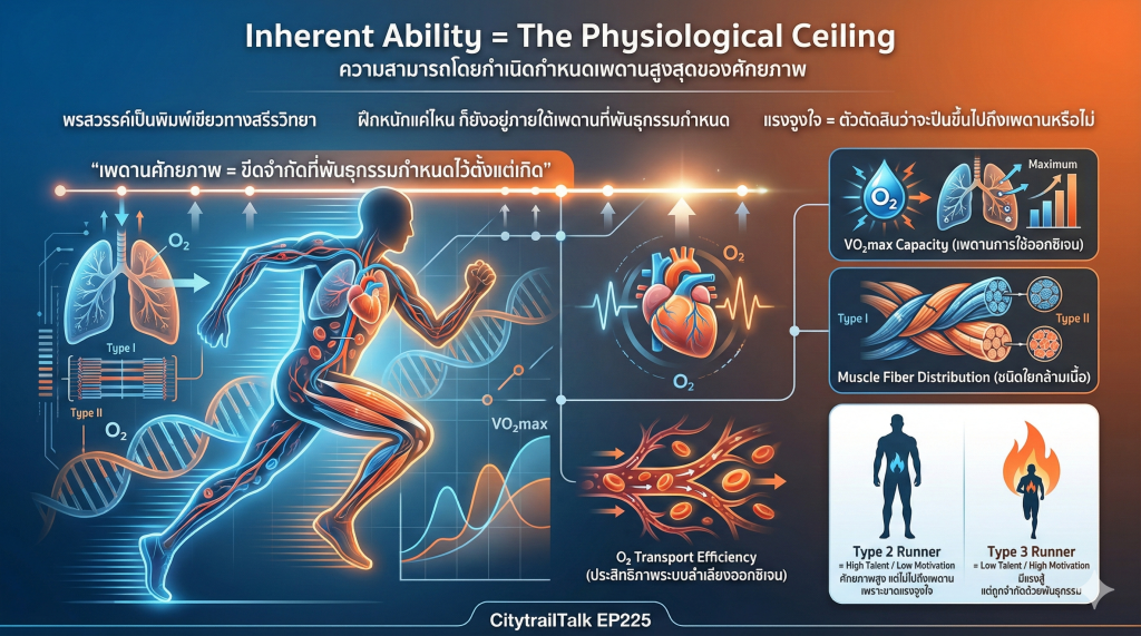1.1. การกำหนดขีดจำกัดสูงสุดทางสรีรวิทยา (The Physiological Ceiling): Daniels ระบุว่า ความสามารถโดยกำเนิดทำหน้าที่เป็นเพดานสูงสุดของศักยภาพในการวิ่ง แม้ว่าการฝึกซ้อมจะเป็นสิ่งสำคัญและสามารถนำไปสู่การพัฒนาได้อย่างมาก แต่การพัฒนานั้นจะเกิดขึ้นภายในขีดจำกัดที่ถูกกำหนดไว้แล้วด้วยพันธุกรรมที่ได้รับมาตั้งแต่แรกเกิด