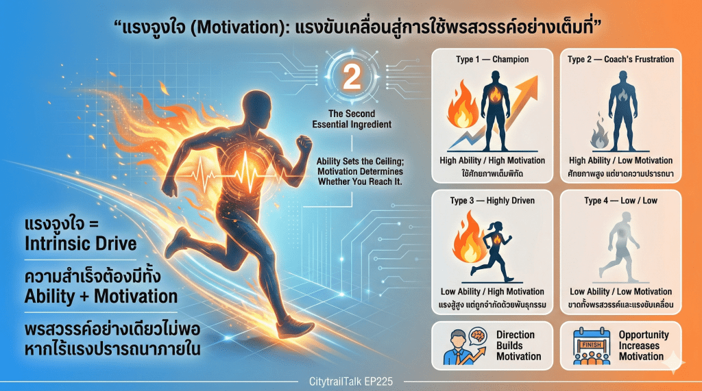 แรงจูงใจ คือองค์ประกอบที่สองและหมายถึงแรงขับเคลื่อนภายใน (intrinsic drive) ซึ่งจำเป็นอย่างยิ่งในการใช้พรสวรรค์ตามธรรมชาติได้อย่างเต็มที่ โค้ชใช้ปฏิสัมพันธ์ระหว่างความสามารถและแรงจูงใจนี้เป็นกรอบในการจำแนกประเภทนักวิ่งออกเป็นสี่กลุ่ม: