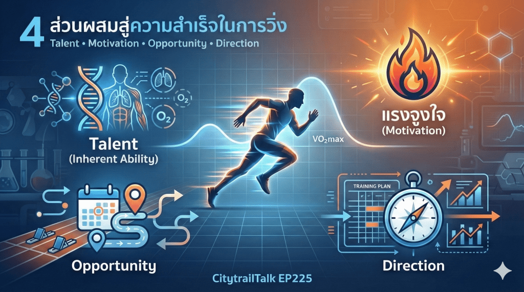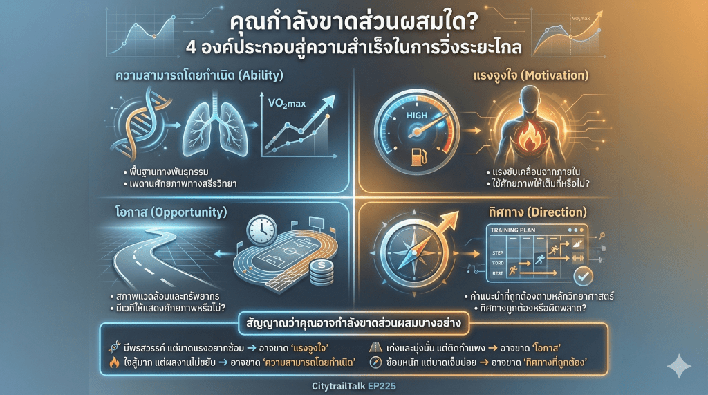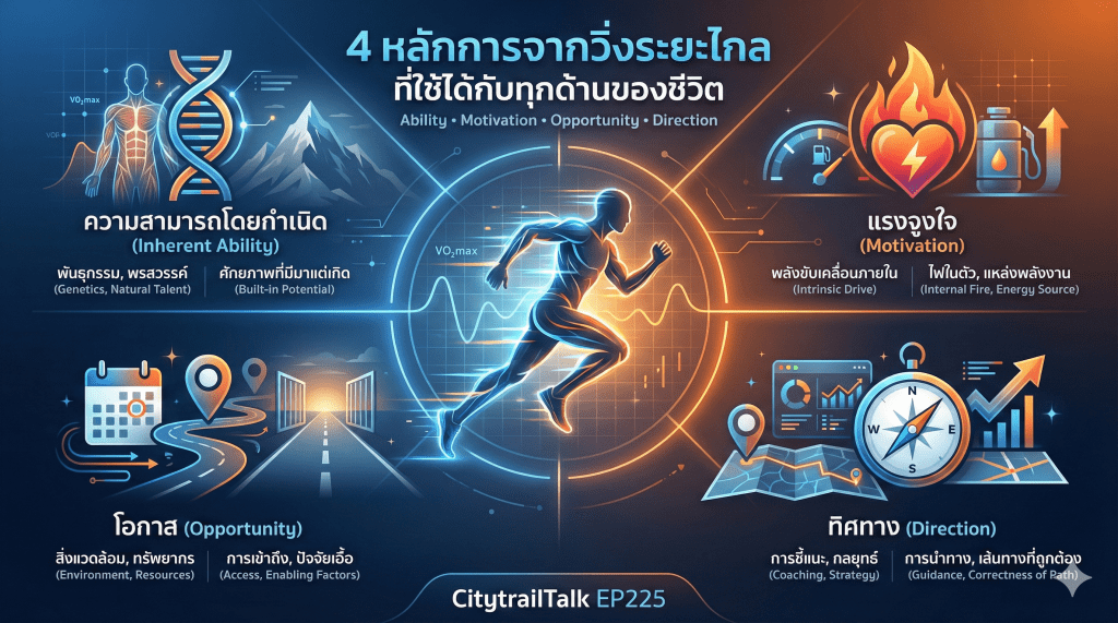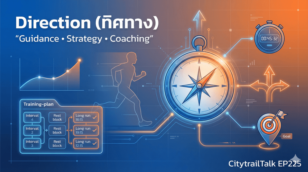 - ความจำเป็นในการเป็นโค้ชที่ดี (Direction): การที่นักวิ่งต้องประเมินโปรแกรมใหม่เมื่อชนกับขีดจำกัดส่วนบุคคล แสดงให้เห็นถึงความจำเป็นในการมี ทิศทาง (Direction) หรือโค้ชที่มีคุณภาพที่สามารถให้คำแนะนำที่ถูกต้อง โดยไม่สั่งให้ “ฝึกหนักขึ้น” อย่างเดียว ซึ่งอาจเป็นตัวอย่างของ “ทิศทางที่ไม่ดี” (Bad Direction),
