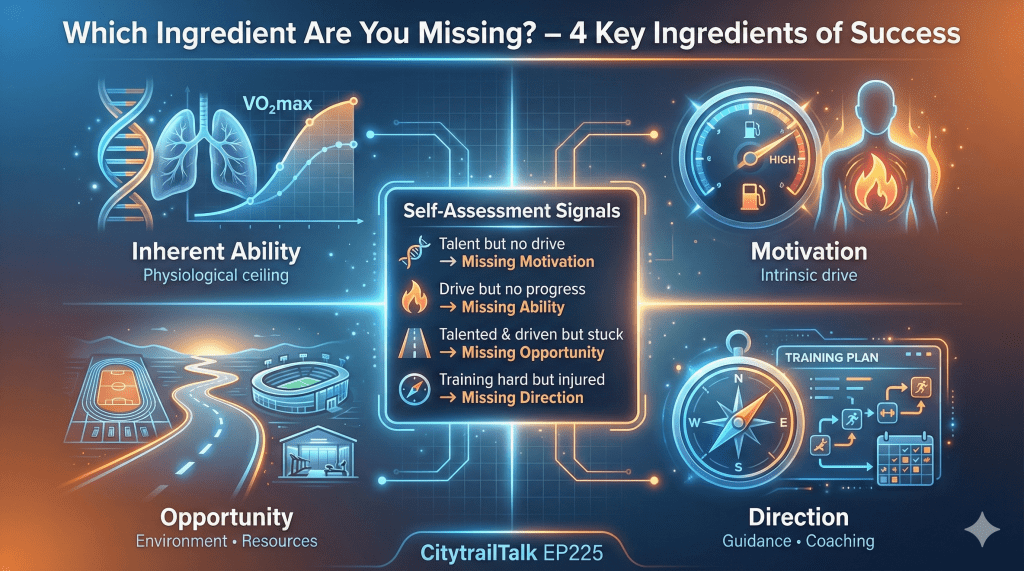 กล่าวโดยสรุป ความสามารถโดยกำเนิดคือ “วัตถุดิบหลัก” หรือ “พรสวรรค์ที่พระเจ้าประทานให้” ที่กำหนดว่านักวิ่งจะสามารถไปได้ไกลแค่ไหน แม้ว่าทุกคนจะมีความสามารถพื้นฐานนี้อยู่ในตัว และเกือบทุกคนก็สามารถพัฒนาได้ แต่การพัฒนาจะจำกัดอยู่ภายในขอบเขตทางพันธุกรรมที่ถูกกำหนดไว้
