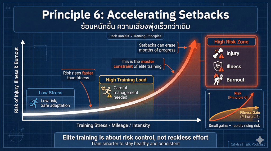 - แนวคิดหลัก: หลักการนี้เป็นด้านกลับที่น่ากลัวของหลักการผลตอบแทนที่ลดน้อยถอยลง (Principle 5) กล่าวคือ ยิ่งภาระการฝึกซ้อมสูงขึ้นเท่าใด ความเสี่ยงต่อการบาดเจ็บ, การเจ็บป่วย หรือภาวะหมดไฟก็จะยิ่งเพิ่มสูงขึ้นแบบทวีคูณ ความล้มเหลวเพียงครั้งเดียว (เช่น การบาดเจ็บ) สามารถทำลายความก้าวหน้าที่สร้างมานานหลายเดือนได้