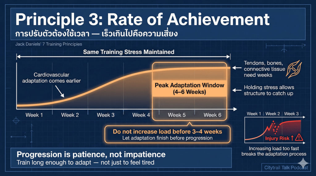 - แนวคิดหลัก: การปรับตัวของร่างกายต่อโปรแกรมการฝึกซ้อมใหม่จะเกิดขึ้นอย่างรวดเร็วในช่วง 4-6 สัปดาห์แรก หลังจากนั้นอัตราการพัฒนาจะเริ่มช้าลง การเพิ่มระดับความหนักของการฝึกซ้อมเร็วเกินไป (เช่น ทุกๆ 1-2 สัปดาห์) จะเพิ่มความเสี่ยงต่อการบาดเจ็บโดยไม่ได้รับประโยชน์สูงสุด