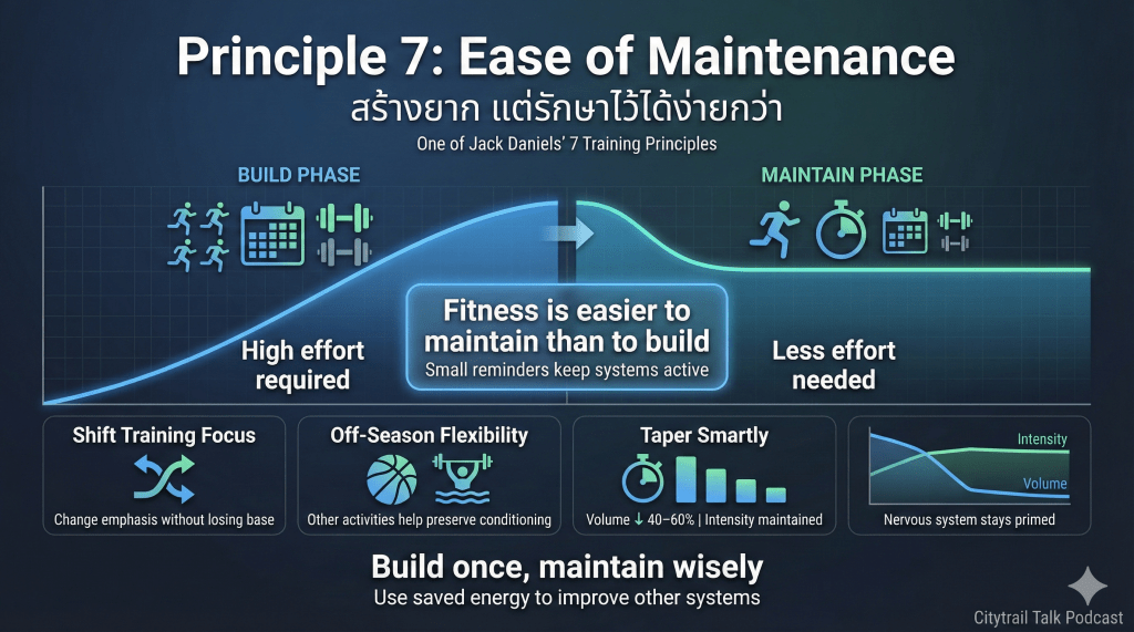 - นัยยะสำคัญต่อการฝึกซ้อม: หลักการนี้ช่วยให้สามารถวางแผนการฝึกซ้อมเป็นช่วง (Periodization) ได้อย่างมีประสิทธิภาพ เช่น หลังจากสร้างฐานแอโรบิกด้วยการวิ่งระยะไกลมาอย่างเต็มที่แล้ว เราสามารถลดปริมาณการวิ่งระยะไกลลงเล็กน้อยเพื่อ “รักษาสภาพ” และหันไปเน้นการพัฒนาความเร็วแทนได้ โดยไม่สูญเสียฐานความทนทานที่สร้างมา