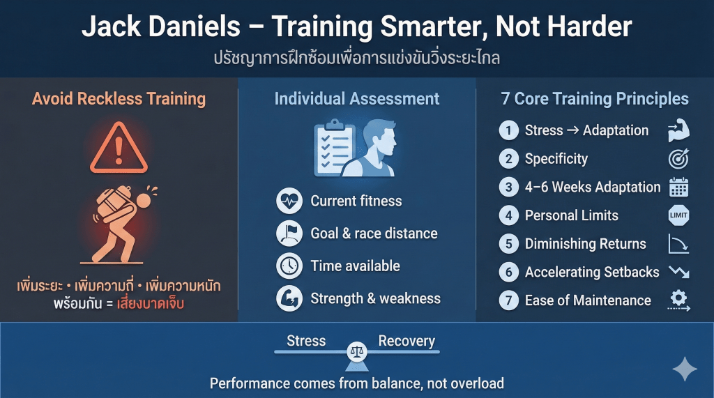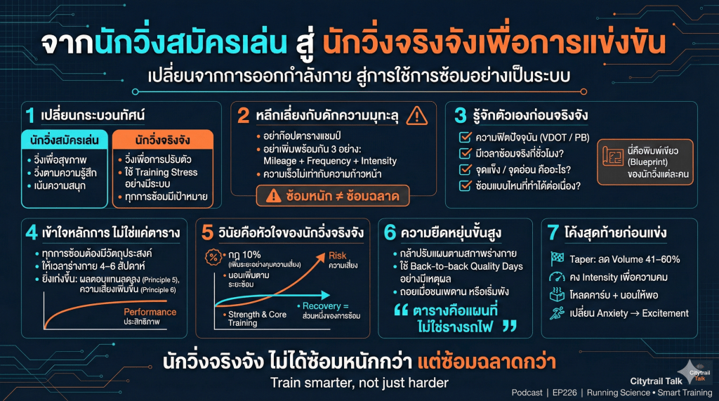 การยกระดับจากการวิ่งเพื่อสุขภาพไปสู่การฝึกซ้อมเพื่อการแข่งขันอย่างจริงจังนั้น เป็นมากกว่าแค่การเพิ่มความเข้มข้น แต่คือการเปลี่ยนแปลงกระบวนทัศน์ครั้งสำคัญ ที่ต้องอาศัยแนวทางที่เป็นระบบ มีหลักการทางวิทยาศาสตร์รองรับ และออกแบบมาเพื่อนักกีฬาแต่ละบุคคลโดยเฉพาะ การพุ่งเข้าสู่การฝึกซ้อมอย่างหนักหน่วงด้วยการ “ทุ่มเทอย่างบ้าคลั่ง” (reckless abandon) โดยปราศจากแผนการที่ชัดเจนและผู้ชี้แนะที่ถูกต้อง ถือเป็นสูตรสำเร็จของความผิดหวังและการบาดเจ็บ ตามที่ Jack Daniels ปรมาจารย์ด้านการวิ่งได้เตือนไว้ ความสำเร็จในการวิ่งระยะไกลไม่ได้วัดกันที่ปริมาณความเหนื่อยยาก แต่คือคุณภาพของการปรับตัวที่เกิดจากความเครียดที่ถูกควบคุมและมีเป้าหมายชัดเจน