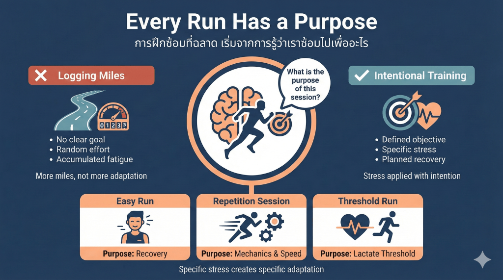 หัวใจสำคัญของการฝึกซ้อมระดับสูงคือการตั้งคำถามนี้กับทุกเซสชันการฝึกซ้อม ทุกการวิ่งต้องมีเป้าหมายทางสรีรวิทยาหรือจิตวิทยาที่ชัดเจน ไม่ใช่เพียงเพื่อสะสมระยะทาง การทำความเข้าใจ “เหตุผล” ที่อยู่เบื้องหลังการฝึกซ้อมแต่ละรูปแบบจะช่วยป้องกันการฝึกซ้อมที่ไร้ทิศทางและเพิ่มประสิทธิภาพสูงสุด
