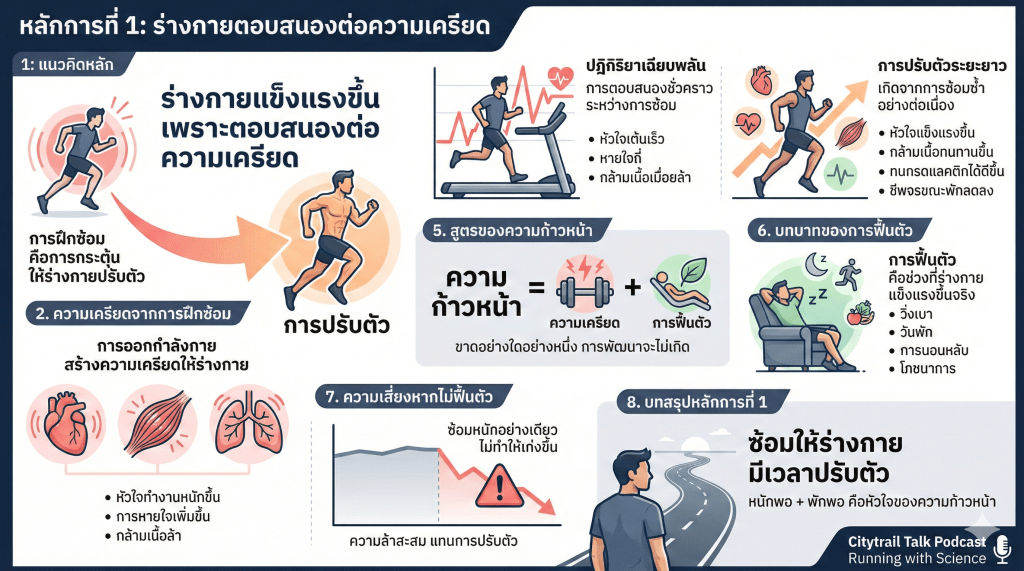- แนวคิดหลัก: การฝึกซ้อมคือการสร้างความเครียด (Stress) ให้กับร่างกาย ซึ่งจะกระตุ้นให้เกิดการปรับตัว (Adaptation) และแข็งแกร่งขึ้นเมื่อได้รับการฟื้นฟูที่เพียงพอ กระบวนการนี้เรียกว่า “Training Effect” ซึ่งเป็นผลลัพธ์ในระยะยาว เช่น หัวใจแข็งแรงขึ้น อัตราการเต้นของหัวใจขณะพักลดลง และร่างกายจัดการกับกรดแลคติกได้ดีขึ้น