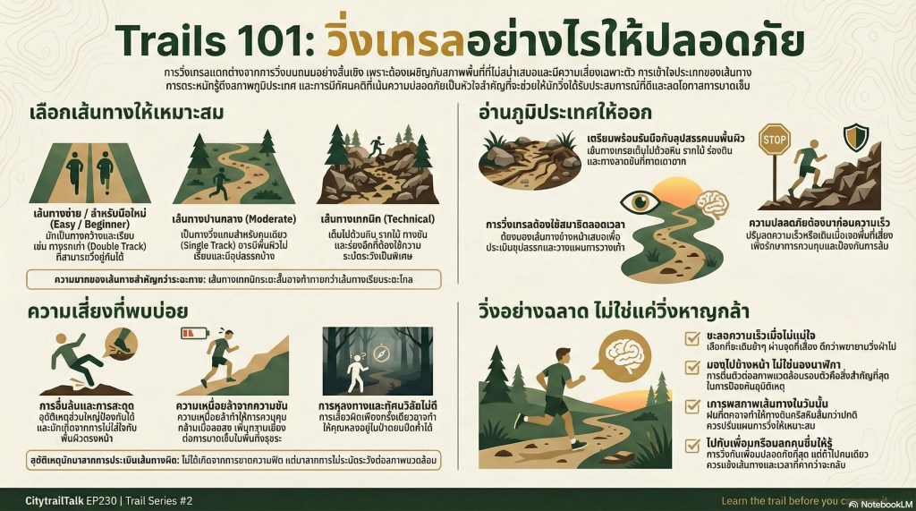 ลองจินตนาการว่าคุณกำลังยืนอยู่ ณ จุดเริ่มต้นของเส้นทางเดินป่า แสงแดดยามเช้าส่องลอดผ่านใบไม้ลงมากระทบพื้นดินเบื้องหน้า คุณได้ยินเสียงนกร้องและรู้สึกถึงลมเย็นๆ ที่พัดผ่าน แต่ในใจกลับเต็มไปด้วยความรู้สึกที่หลากหลาย ทั้งความตื่นเต้นที่จะได้ผจญภัยและความประหม่าเล็กน้อยเมื่อนึกถึงคำศัพท์ที่ไม่คุ้นเคยอย่าง ‘single-track’ หรือ ‘technical trail’ คุณอาจกำลังสงสัยว่า “เราจะเริ่มต้นจากตรงไหน?” หรือ “ต้องเตรียมตัวอย่างไรบ้าง?”