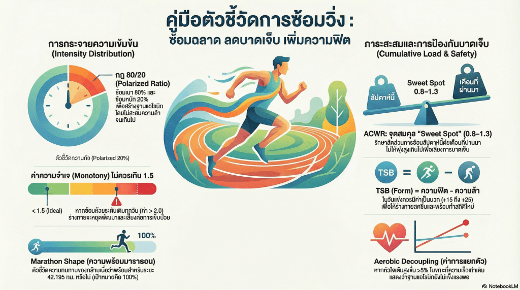 การตรวจสอบการกระจายความเข้มข้นอย่างเป็นระบบจะช่วยให้นักวิ่งสามารถบริหารจัดการ ความฟิต (CTL) และ ความล้า (ATL) ให้อยู่ในจุดที่เหมาะสมที่สุด (Sweet Spot) เพื่อก้าวไปสู่จุดสูงสุดของสมรรถภาพโดยไม่ประสบความล้มเหลวทางชีวภาพไปเสียก่อน,,
