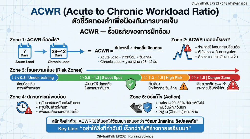 แหล่งข้อมูลระบุว่า ACWR (Acute to Chronic Workload Ratio) คือ “ตัวชี้วัดทองคำ” สำหรับการป้องกันการบาดเจ็บในบริบทของภาระงานสะสม,