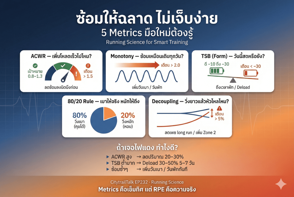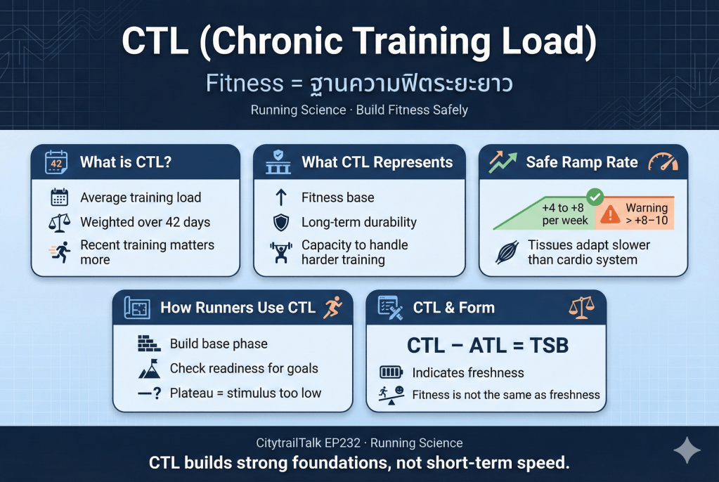 - ช่วงสร้างฐาน (Base): เน้นเพิ่ม CTL อย่างมั่นคง (Ramp Rate 4-8 แต้มต่อสัปดาห์) และลดค่า Decoupling ให้ต่ำกว่า 5%,