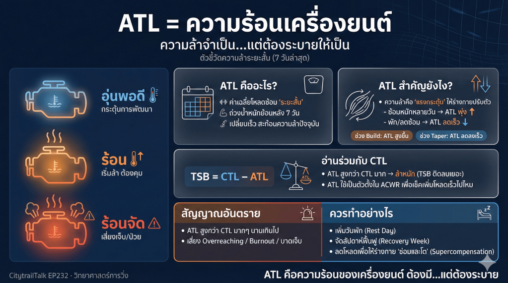 - ATL (Acute Training Load) หรือ “ความล้า” (Fatigue): คือค่าเฉลี่ยถ่วงน้ำหนักของ TSS ในช่วง 7 วันล่าสุด สะท้อนถึงความเหนื่อยล้าที่ร่างกายได้รับในปัจจุบัน,,