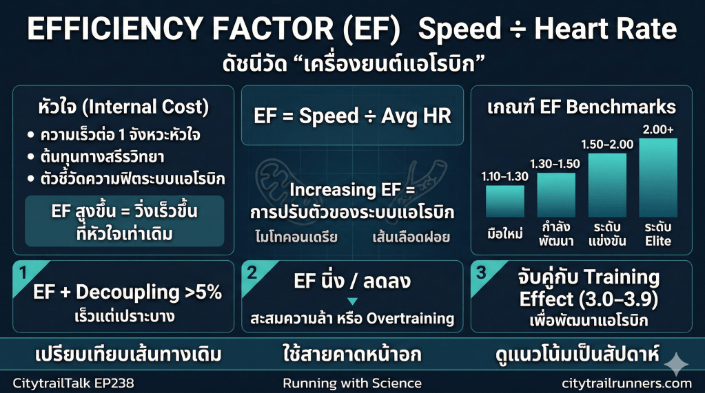 Efficiency Factor (EF) คือตัวเลขที่บอกว่านักวิ่งสามารถสร้างความเร็วได้มากแค่ไหนต่ออัตราการเต้นของหัวใจหนึ่งครั้ง,