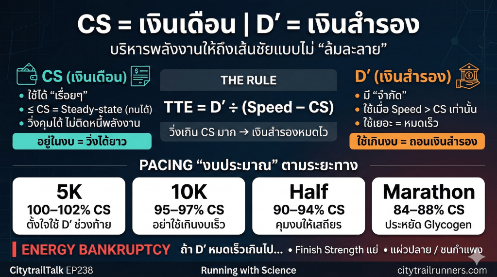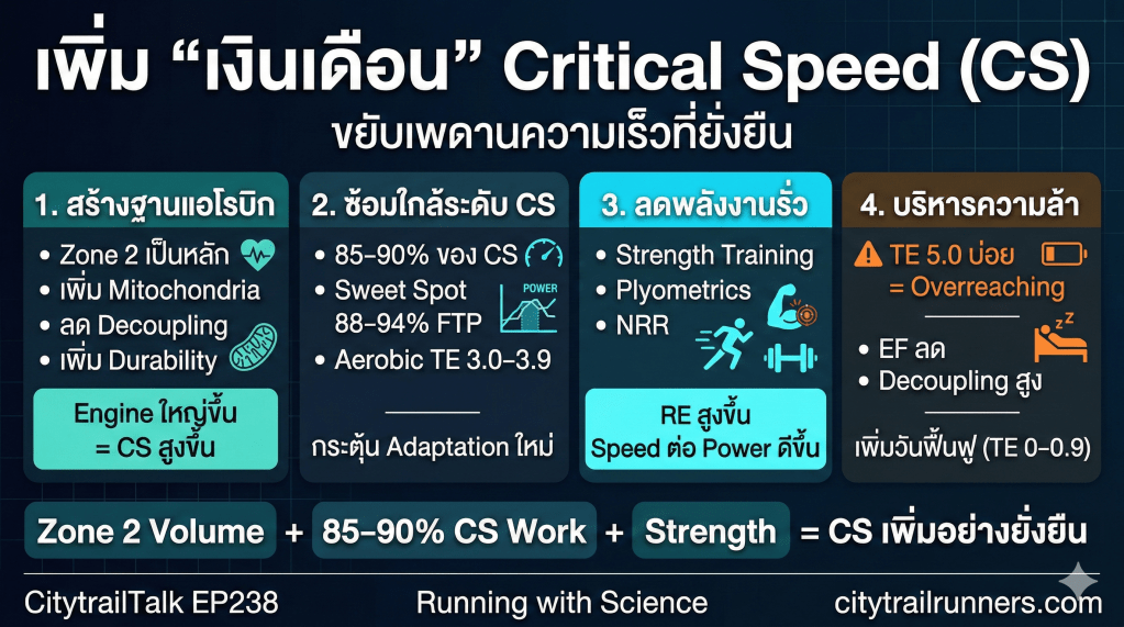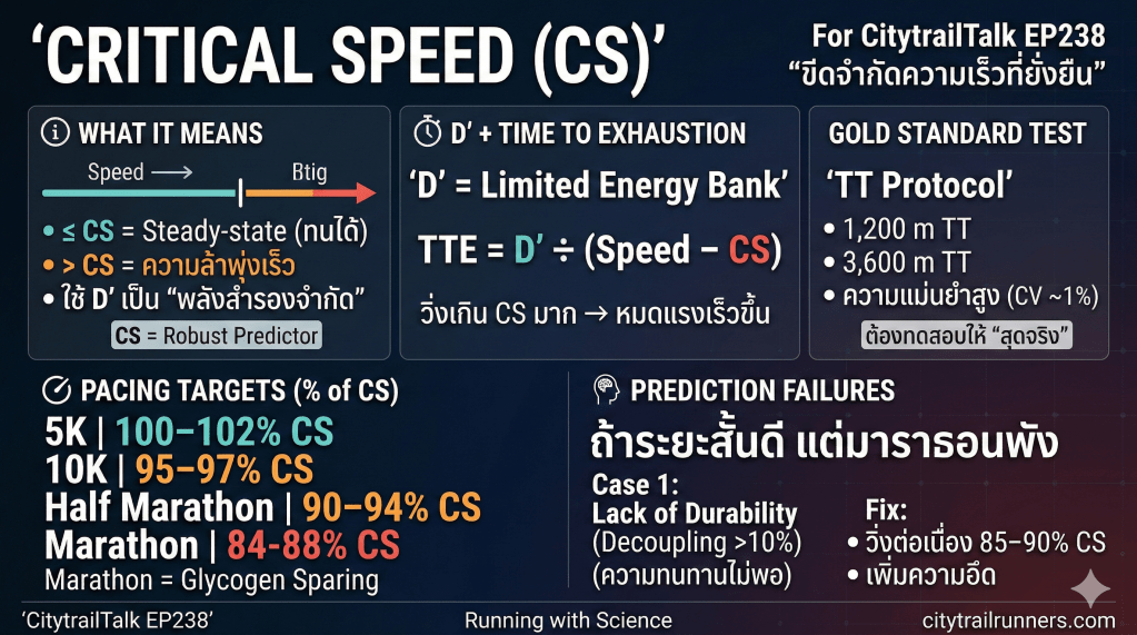 - มาราธอน: วิ่งที่ 84%–88% ของ CS เพื่อประหยัดไกลโคเจน (Glycogen Sparing) และควรเริ่มอย่างระมัดระวัง