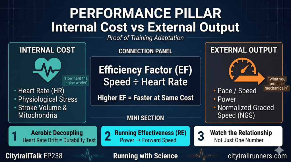 ตัวชี้วัดในด้าน Performance Pillar หรือ “เสาหลักด้านประสิทธิภาพ” คือกรอบโครงสร้างเชิงปริมาณที่ใช้เพื่อประเมินผลลัพธ์จากการวิ่งและการปรับตัวจากการฝึกซ้อม โดยทำหน้าที่เป็น “ข้อพิสูจน์” (Proof) ว่าโปรแกรมการฝึกซ้อมบรรลุผลสำเร็จในด้านประสิทธิภาพ ความทนทาน และความเร็วในการแข่งขัน