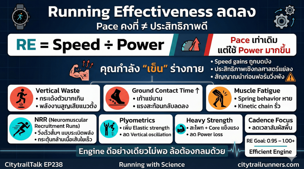 - สัญญาณเตือนความเหนื่อยล้า: หากค่า RE ตกลงในช่วงท้ายของการวิ่ง มักเป็นสัญญาณของ “การพังทลายของท่าวิ่ง” (Biomechanical Breakdown) ซึ่งร่างกายเริ่มเสียพลังงานไปกับการเคลื่อนไหวที่เปล่าประโยชน์เนื่องจากความล้า