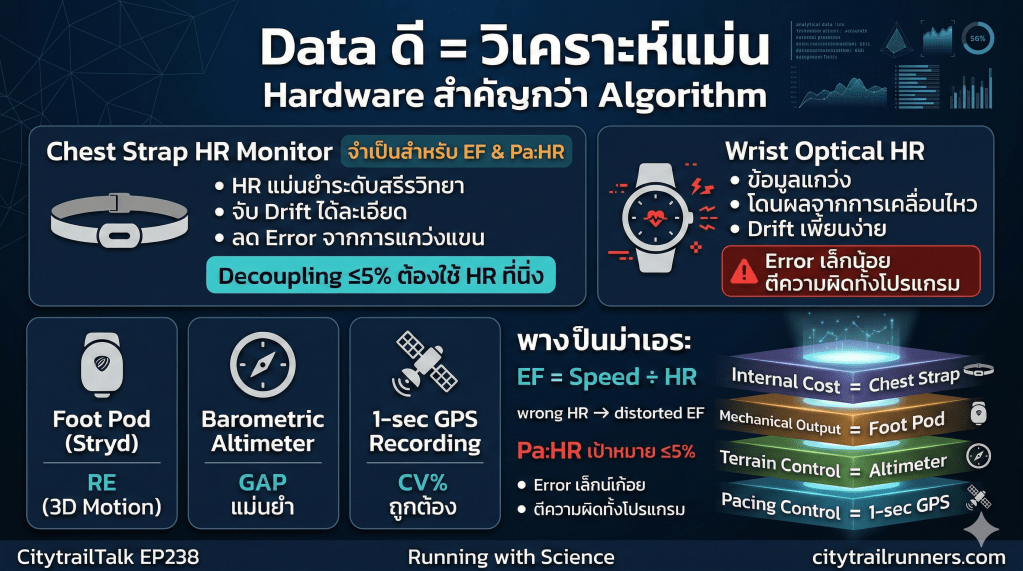 เพื่อให้ได้ค่า Pa:HR ที่แม่นยำ แหล่งข้อมูลเน้นย้ำว่าควรใช้ สายคาดหน้าอก (Chest Strap Heart Rate Monitor) เนื่องจากเซนเซอร์แบบออปติคอลที่ข้อมือมักจะมีความคลาดเคลื่อนสูงเกินไปสำหรับการคำนวณค่า Drift ที่ละเอียดอ่อนเช่นนี้
