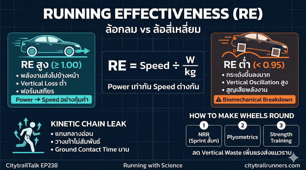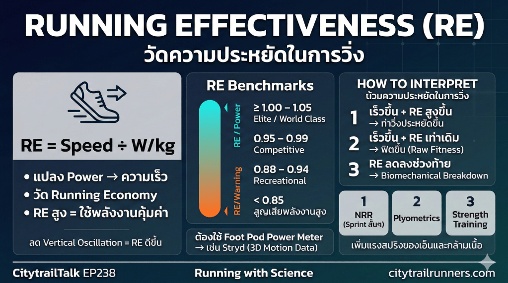 ตัวชี้วัด Running Effectiveness (RE) ถือเป็นเครื่องมือสำคัญในกลุ่ม ตัวชี้วัดเชิงกลศาสตร์และพลัง (Mechanical & Power) ซึ่งทำหน้าที่ประเมินความประหยัดในการวิ่ง (Running Economy) โดยใช้ข้อมูลจากมาตรวัดพลังงาน (Power Meter) เป็นฐานในการคำนวณ