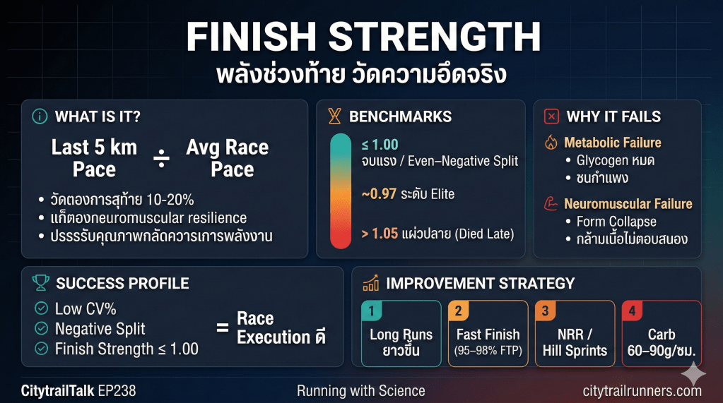 - Finish Strength: ประเมินความสามารถในการรักษาระดับหรือเร่งความเร็วในช่วง 10–20% สุดท้ายของการแข่งขันเทียบกับความเร็วเฉลี่ย