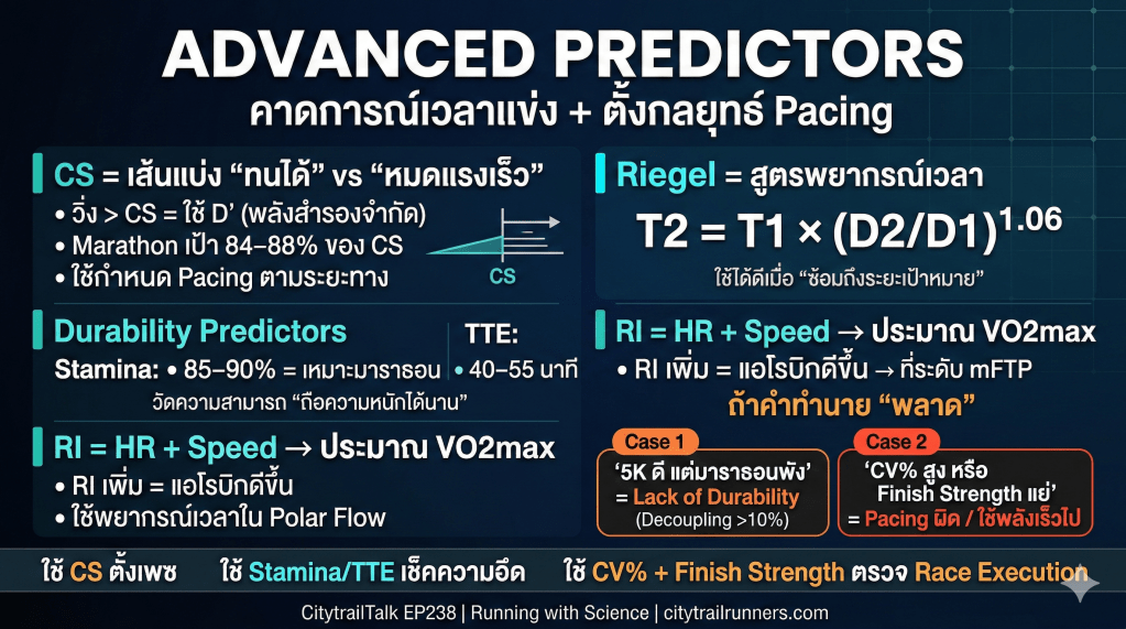 บทสรุปการบูรณาการ: การพยากรณ์ผลการแข่งขันจะมีประสิทธิภาพสูงสุดเมื่อดูร่วมกับ Finish Strength (ความสามารถในการเร่งช่วงท้าย) และ Efficiency Factor เพื่อยืนยันว่านักวิ่งมีความฟิตในระดับที่แบบจำลองคาดการณ์ไว้จริงๆ,