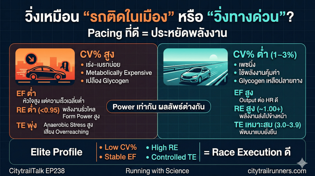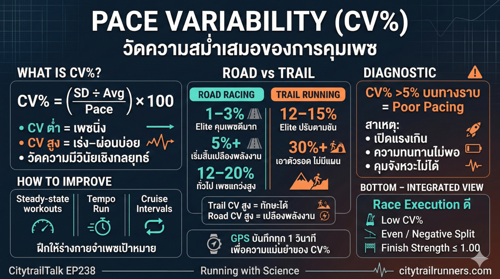 - Pace Variability (CV%): วัดความคงเส้นคงวาของความเร็ว ค่า CV% ที่ต่ำ (ประมาณ 1–3% ในระดับ Elite) บ่งบอกถึงการควบคุมความเร็วที่ดีบนถนน