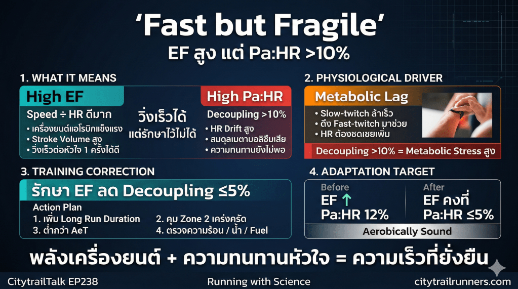 หนึ่งในข้อมูลที่น่าสนใจที่สุดคือกรณีที่นักวิ่งมี ค่า EF สูง (ดูเหมือนฟิตมาก) แต่มีค่า Decoupling สูง (>10%)