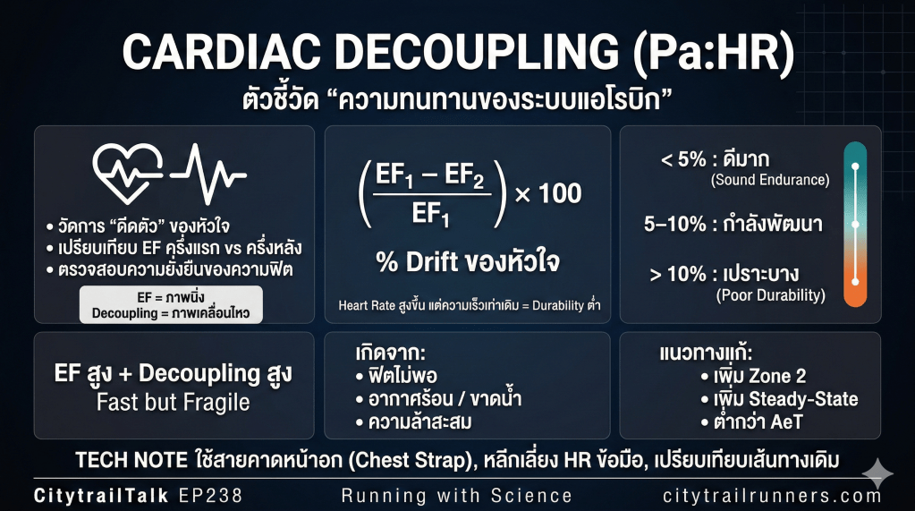 - EF vs. Aerobic Decoupling (Pa:HR): หาก EF คือ “ภาพนิ่ง” ของประสิทธิภาพ Decoupling คือ “ภาพเคลื่อนไหว” ที่วัดว่านักวิ่งสามารถรักษา EF นั้นไว้ได้ตลอดระยะเวลาการวิ่งหรือไม่ หากวิ่งไปครึ่งหลังแล้ว EF ลดลง (ทำให้เกิดค่า Decoupling > 5%) แสดงว่าความทนทานยังไม่เพียงพอ หรือที่เรียกว่าภาวะ “Fast but fragile” (วิ่งเร็วแต่เปราะบาง),