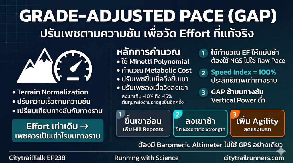 ตัวชี้วัด Grade-Adjusted Pace (GAP) หรือที่บางแพลตฟอร์มเรียกว่า Normalized Graded Pace (NGP) คือตัวชี้วัดที่ใช้เพื่อ “ปรับค่าความเร็วให้เป็นมาตรฐาน” (Terrain Normalization) โดยคำนวณว่าหากนักวิ่งวิ่งด้วยความพยายาม (Effort) เท่าเดิมบนพื้นราบ ความเร็วที่ได้จะเป็นเท่าใด,
